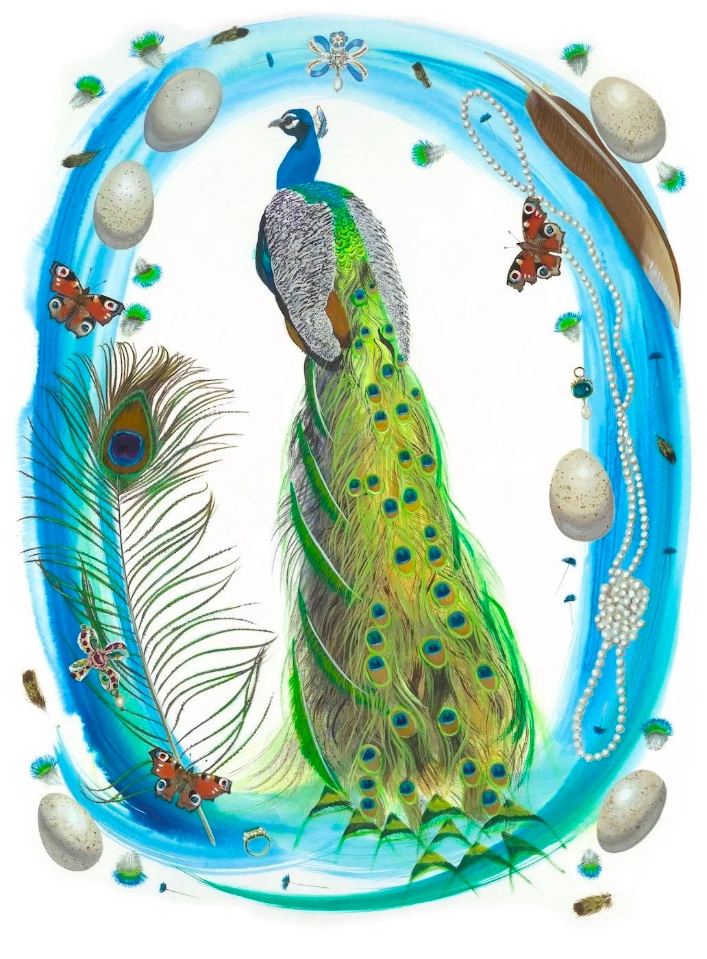 In my painting, I chose to render only the male peacock, the bird we encounter in Shakespeare’s plays. The composition is dotted with three peacock butterflies, one of the most common butterflies in England.