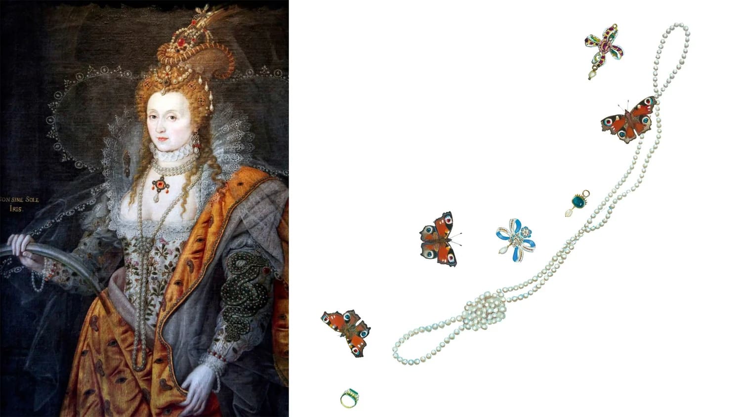 Image: The Rainbow Portrait of Queen Elizabeth I inspired the jewelry selection in my peacock painting.